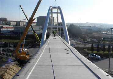 Passagem superior de peões – GuardaSolução metálica com incorporação de lages de betão pré-fabricado.