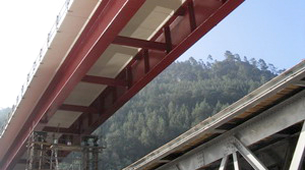 Solução de tabuleiro com lajes plenas assentes em longarinas metálicas.